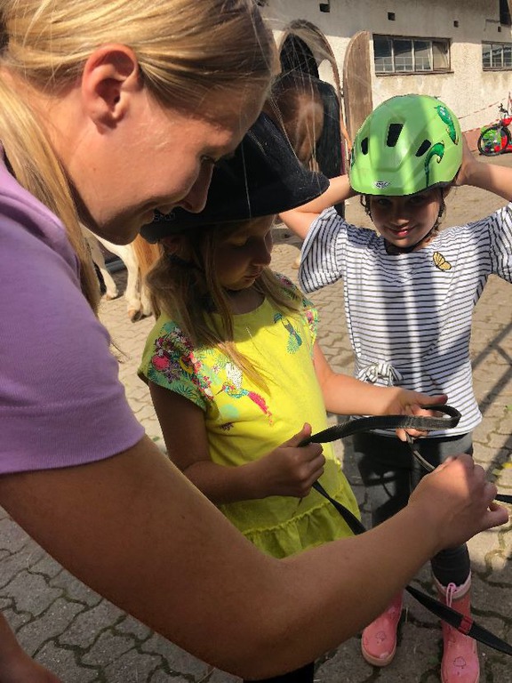 Die Kinder lernen alles rund um das Thema Pferde & Ponys, angefangen beim Putzen und Berühren, über die Versorgung bis hin zu ersten Reitversuchen. Auf, neben und um das Pferd werden altersgerechte Spiele durchgeführt, um die Teamfähigkeit aber auch das Geschick des Kindes zu fördern. Durch den frühen Kontakt zu den Ponys lernen die Kinder außerdem frühzeitg selbstständig und verantwortungsbewusst zu handeln.